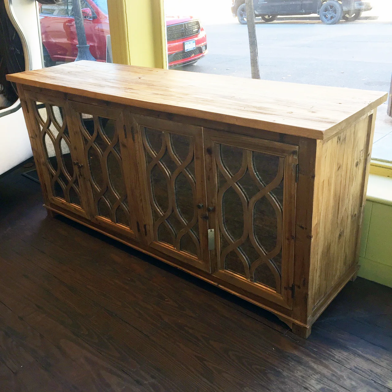 Antiqued Mirrored Doors and Fixed Interior Wood Shelving.
